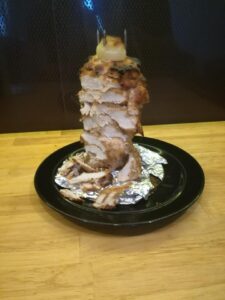 Domowy kebab można podać w towarzystwie domowych frytek (ziemniaki pokrojone w słupki, odsączone na ściereczce i upieczone w 180°C do pożądanej chrupkości) oraz surówki.