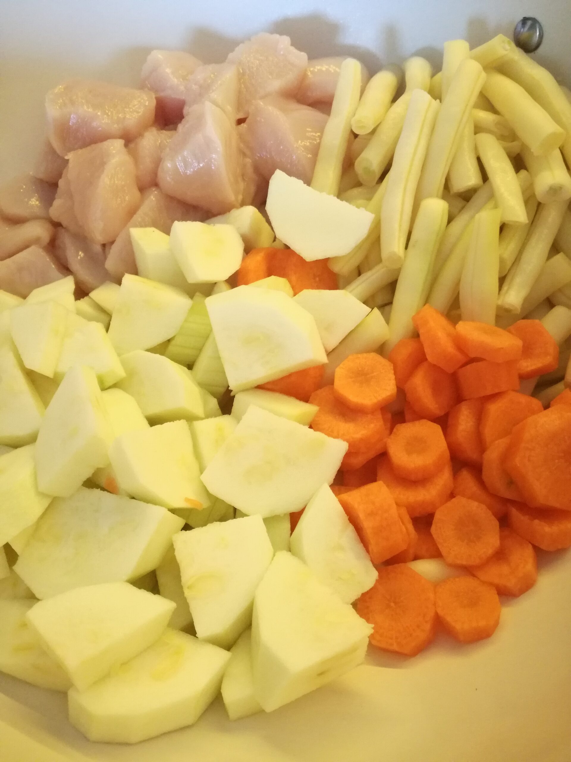Mięso oczyszczamy i kroimy w kostkę. Marchewkę kroimy w plasterki, cukinię w kostkę. Na suchy, nierozgrzany wok (o nieprzywierającej powłoce) wrzucamy mięso oraz warzywa, zalewamy przecierem pomidorowym, doprawiamy solą i ziołami. Dusimy pod przykryciem do uzyskania miękkości warzyw oraz mięsa. Jeżeli warzywa puszczą zbyt dużo wody na koniec danie dusimy jeszcze ok 10-15 min bez przykrycia. Gotowe danie podajemy z makaronem i mozzarellą lub brązowym ryżem.