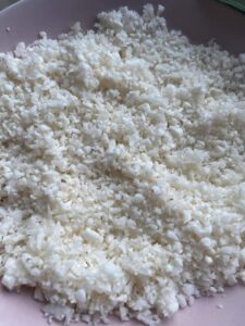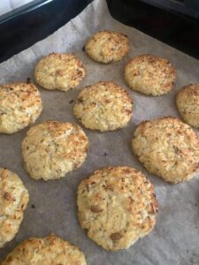 Piekarnik rozgrzać do 180 stopni, blachę do pieczenia wyłożyć papierem. Kalafiora wraz z łodygą zetrzeć na dużych oczkach tarki, cebulę zetrzeć na dużych oczkach tarki, a czosnek na małych oczkach. Wszystko przełożyć do bardzo dużej miski.