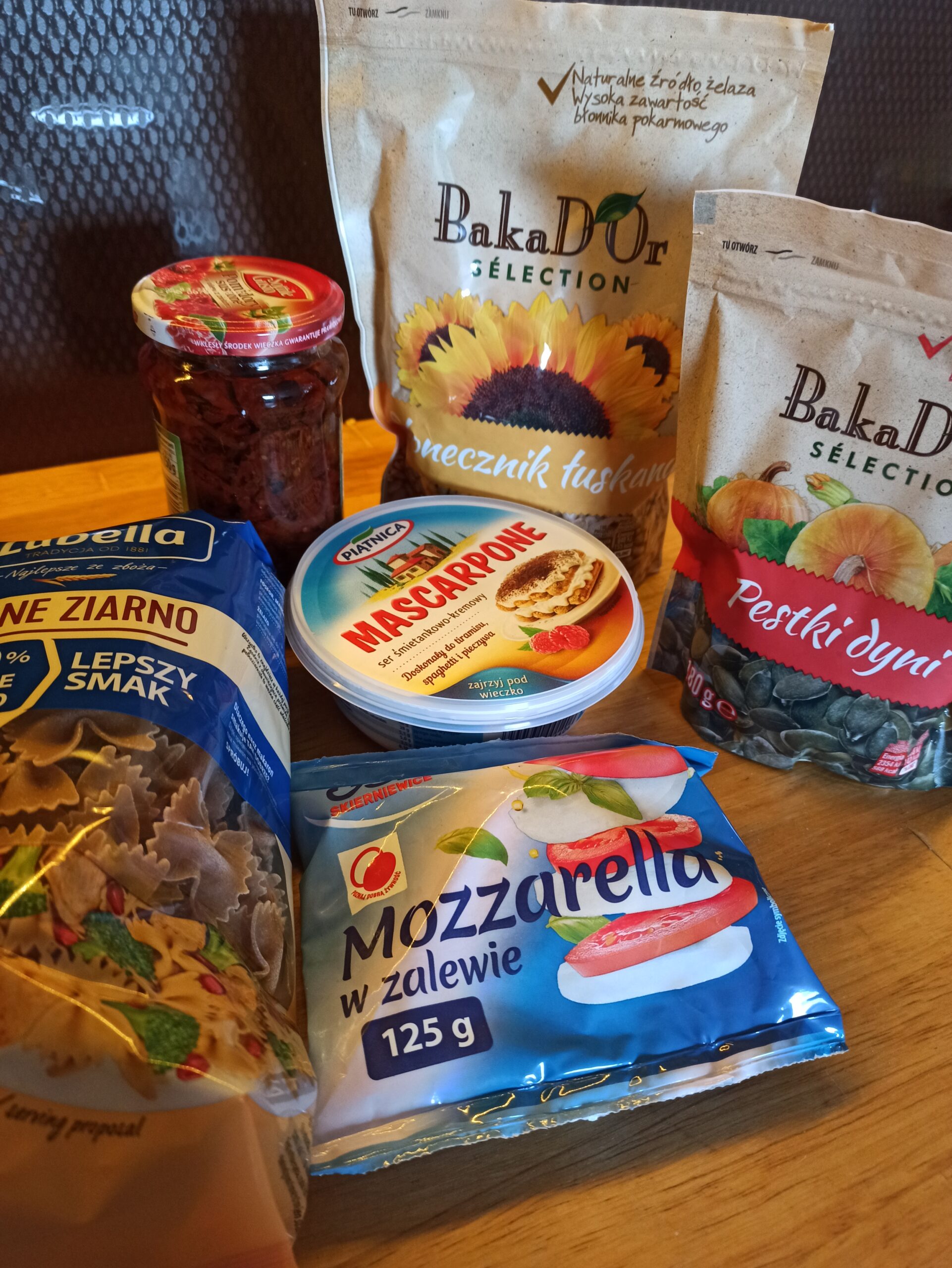 Makaron ugotować al dente. Podczas gotowania makaronu pokroić w kostkę pomidory. Makaron odcedzić, zachować niewielką ilość wody w rondlu. Dodać do niej serek wraz ze startą mozzarellą i mieszać na niewielkim ogniu aż do rozpuszczenia. Wtedy dodać pomidory z dynią i słonecznikiem, doprawić do smaku pieprzem. Makaron dodać do sosu, starannie wymieszać i ułożyć na talerzu.