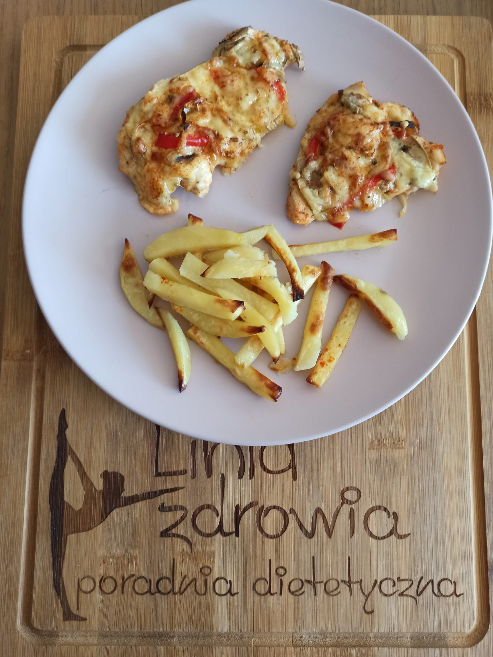 Pierś z kurczaka przekroić na pół i rozbić z obu stron na cienki kotlet. Doprawić solą, słodką papryką i oregano. Na wierz położyć pokrojoną cebulę, pieczarki i paprykę, posypać parmezanem i oregano. Położyć na blasze na pergaminie, włożyć do rozgrzanego piekarnika i zapiekać ok. 30 minut. Podawać z frytkami i warzywami.
