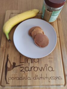 Placuszki bananowe na 1 porcję: 2 jajka banan 2 łyżki mąki najlepiej razowej/ pełnoziarnistej Jajka blendujemy z bananem. Dodajemy mąkę i dokładnie mieszamy. Smażymy na patelni bez tłuszczu. podajemy z kwaskowym owocem np. kiwi, malinami lub masłem orzechowym.