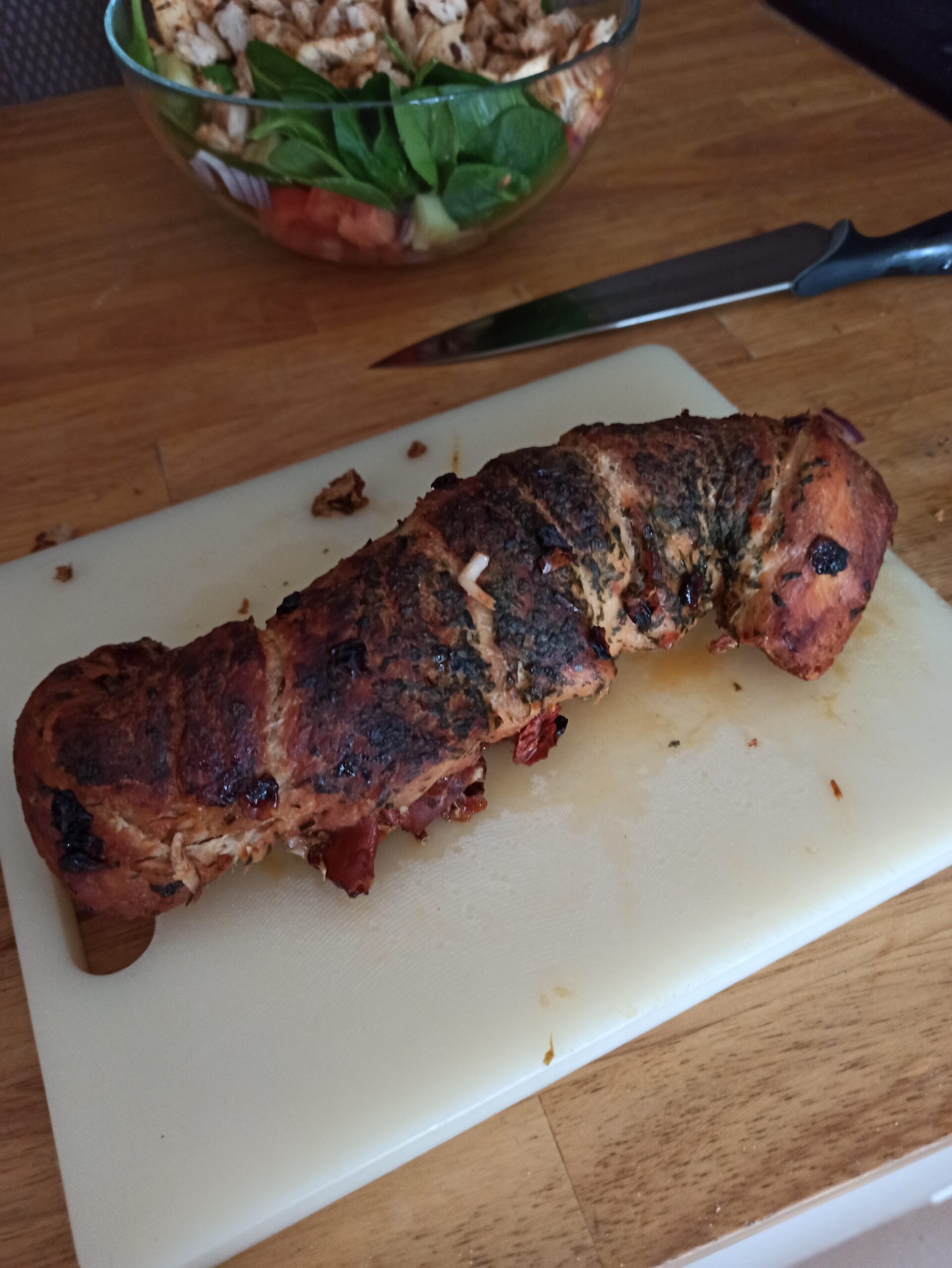 Ze schabu wyciąć białe błonki. Rozciąć tak aby powstał jeden duży kawałek. Rozbić tłuczkiem następnie posypać solą, pieprzem, czosnkiem niedźwiedzim, pomidorami suszonymi, położyć plastry szynki. Zawinąć jak roladę, związać sznurkiem, ponownie posypać pomidorami i czosnkiem. Umieścić w rękawie, wlać 100ml wody. Piec w temperaturze 200 st. C. grzanie góra – dół, ok 1,5 h. 15 min przed końcem rozciąć rękaw i dalej piec.